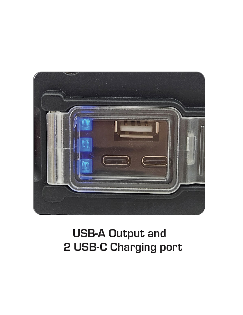 - USB output: 5V 2A for mobile device charging